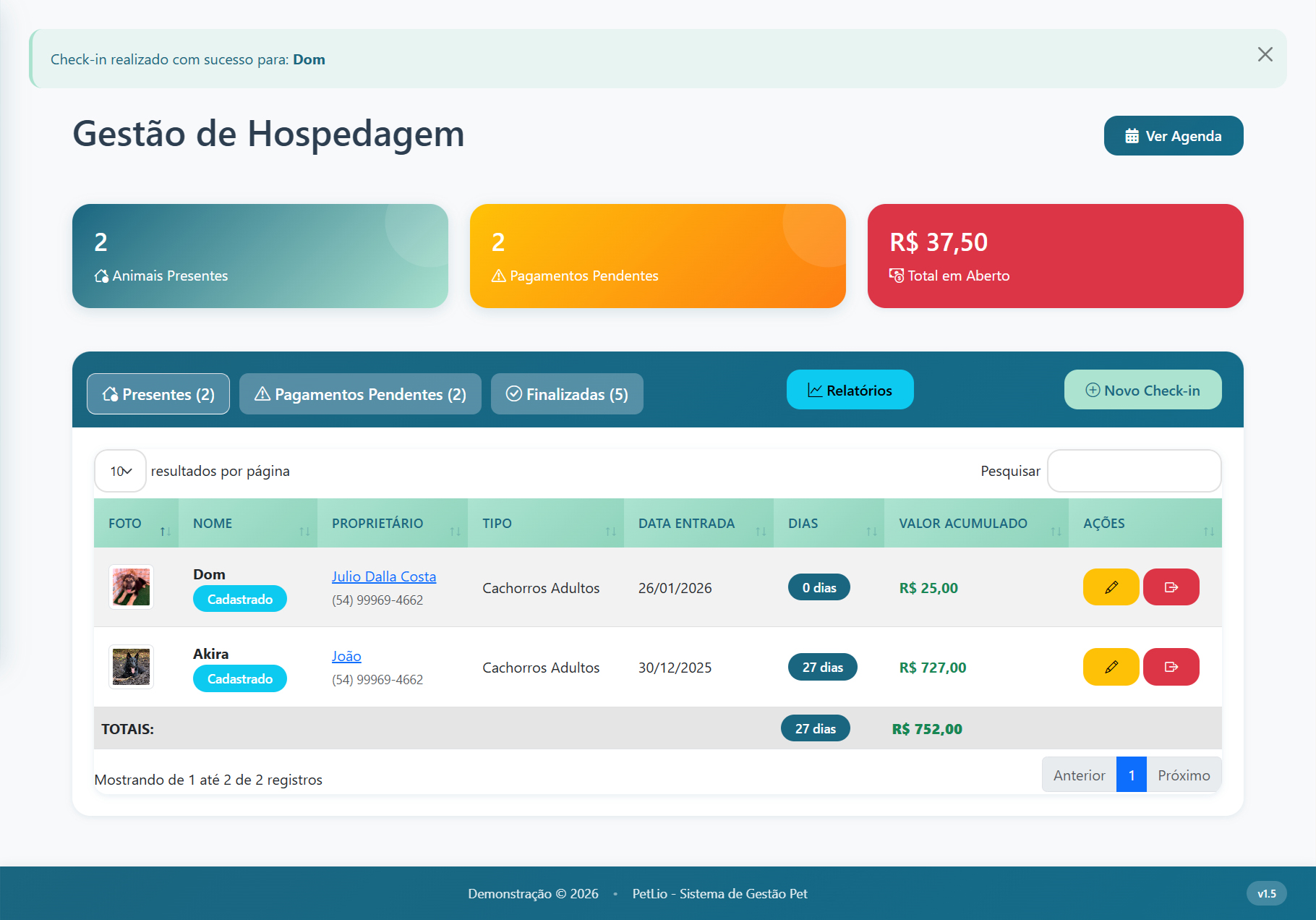 Cadastro completo com fotos e histórico de hospedagens anteriores.